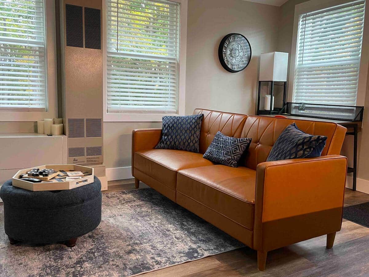 This Pet Friendly unit has a Queen bed that’s very comfortable, the couch in the pictures folds down and turns into a (full size) sleeping area for 1 Adult or 2 kids comfortably. Bathroom offers shampoo, conditioner, and body wash. Towels (body and hand), face cloths, and toiletries are all ready for you when you arrive. Living Room has a Smart TV, and air purifier machine + window AC’s. Kitchen is fully stocked and includes a microwave, coffee machine.